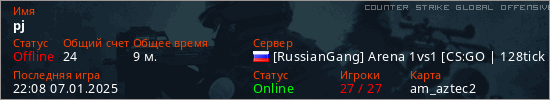 Играет на Counter Strike Global Offensive сервере. Страна: РоссияПервый раз замечен 20:40 07.01.2025