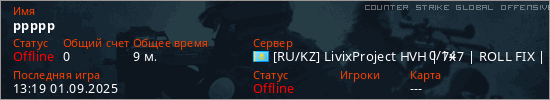 Играет на Counter Strike Global Offensive сервере. Страна: КазахстанПервый раз замечен 09:37 01.09.2025