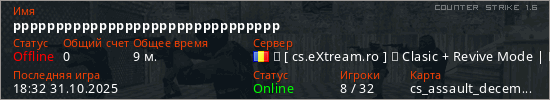 Играет на Counter Strike 1.6 сервере. Страна: РумынияПервый раз замечен 18:15 31.10.2025
