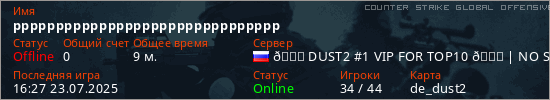 Играет на Counter Strike Global Offensive сервере. Страна: РоссияПервый раз замечен 16:02 23.07.2025