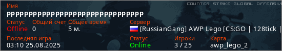 Играет на Counter Strike Global Offensive сервере. Страна: РоссияПервый раз замечен 02:43 25.08.2025