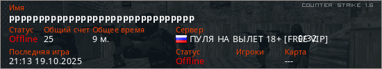 Играет на Counter Strike 1.6 сервере. Страна: РоссияПервый раз замечен 20:45 19.10.2025