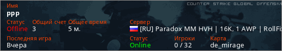 Играет на Counter Strike Global Offensive сервере. Страна: РоссияПервый раз замечен 17:42 18.01.2026