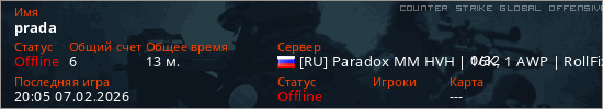Играет на Counter Strike Global Offensive сервере. Страна: РоссияПервый раз замечен 17:02 04.02.2026