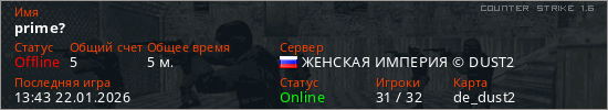 Играет на Counter Strike 1.6 сервере. Страна: РоссияПервый раз замечен 13:39 22.01.2026