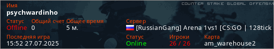 Играет на Counter Strike Global Offensive сервере. Страна: РоссияПервый раз замечен 15:41 27.07.2025
