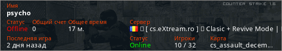 Играет на Counter Strike 1.6 сервере. Страна: РумынияПервый раз замечен 01:16 09.02.2025