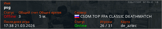 Играет на Counter Strike 1.6 сервере. Страна: РоссияПервый раз замечен 17:34 21.03.2026