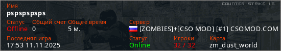 Играет на Counter Strike 1.6 сервере. Страна: РоссияПервый раз замечен 17:51 11.11.2025