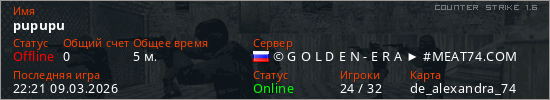 Играет на Counter Strike 1.6 сервере. Страна: РоссияПервый раз замечен 22:15 09.03.2026