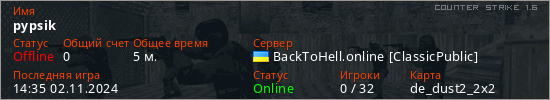 Последний раз был в сети 14:35 02.11.2024 Игрок с таким ником замечен на 31 сервере