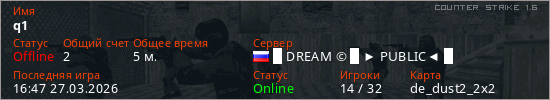 Играет на Counter Strike 1.6 сервере. Страна: РоссияПервый раз замечен 16:43 27.03.2026