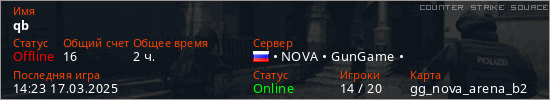Играет на Counter Strike Source сервере. Страна: РоссияПервый раз замечен 20:03 01.03.2025