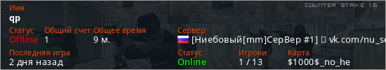 Играет на Counter Strike 1.6 сервере. Страна: РоссияПервый раз замечен 10:34 11.01.2026