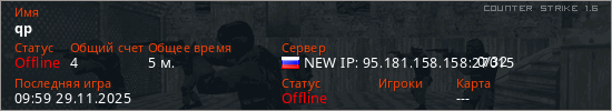 Играет на Counter Strike 1.6 сервере. Страна: РоссияПервый раз замечен 09:53 29.11.2025