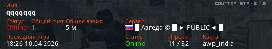 Играет на Counter Strike 1.6 сервере. Страна: РоссияПервый раз замечен 18:17 10.04.2026