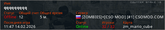 Играет на Counter Strike 1.6 сервере. Страна: РоссияПервый раз замечен 11:45 14.02.2026