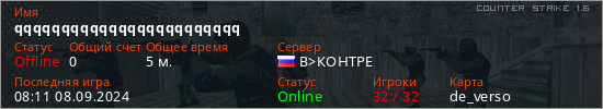 Играет на Counter Strike 1.6 сервере. Страна: РоссияПервый раз замечен 08:09 08.09.2024