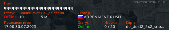 Играет на Counter Strike 1.6 сервере. Страна: РоссияПервый раз замечен 16:29 30.07.2025