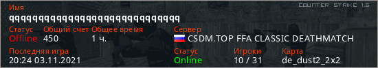 Играет на Counter Strike 1.6 сервере. Страна: РоссияПервый раз замечен 23:11 02.11.2021