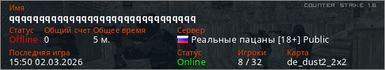 Играет на Counter Strike 1.6 сервере. Страна: РоссияПервый раз замечен 15:48 02.03.2026