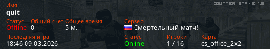 Играет на Counter Strike 1.6 сервере. Страна: РоссияПервый раз замечен 18:43 09.03.2026