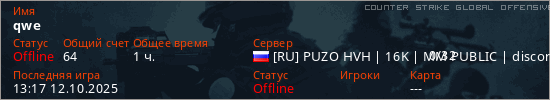 Играет на Counter Strike Global Offensive сервере. Страна: РоссияПервый раз замечен 17:30 06.05.2025