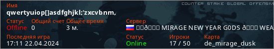 Играет на Counter Strike Global Offensive сервере. Страна: РоссияПервый раз замечен 17:11 22.04.2024