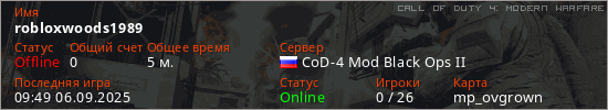 Играет на Call of Duty 4: Modern Warfare сервере. Страна: РоссияПервый раз замечен 09:47 06.09.2025