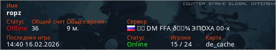 Играет на Counter Strike Global Offensive сервере. Страна: РоссияПервый раз замечен 14:30 16.02.2026