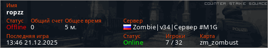 Играет на Counter Strike Source сервере. Страна: РоссияПервый раз замечен 13:36 21.12.2025