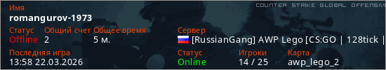 Играет на Counter Strike Global Offensive сервере. Страна: РоссияПервый раз замечен 13:56 22.03.2026