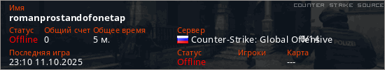 Играет на Counter Strike Source сервере. Страна: РоссияПервый раз замечен 23:02 11.10.2025