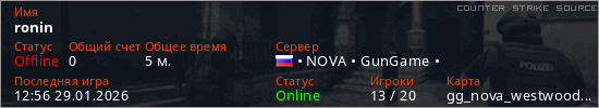 Играет на Counter Strike Source сервере. Страна: РоссияПервый раз замечен 12:48 29.01.2026