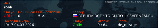 Играет на Counter Strike Global Offensive сервере. Страна: РоссияПервый раз замечен 19:10 04.03.2026