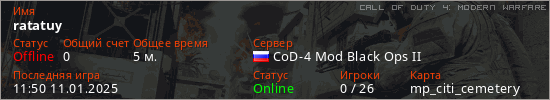 Играет на Call of Duty 4: Modern Warfare сервере. Страна: РоссияПервый раз замечен 11:48 11.01.2025