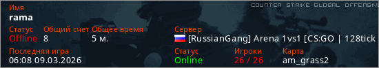 Играет на Counter Strike Global Offensive сервере. Страна: РоссияПервый раз замечен 06:01 09.03.2026