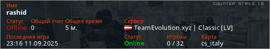 Играет на Counter Strike 1.6 сервере. Страна: ЛатвияПервый раз замечен 22:20 11.09.2025