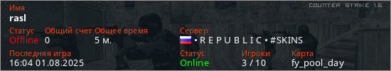 Играет на Counter Strike 1.6 сервере. Страна: РоссияПервый раз замечен 15:56 01.08.2025