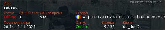 Играет на Counter Strike 1.6 сервере. Страна: РумынияПервый раз замечен 20:35 19.11.2025