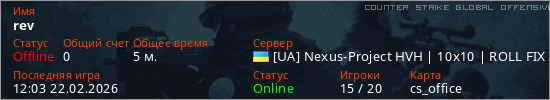 Играет на Counter Strike Global Offensive сервере. Страна: УкраинаПервый раз замечен 12:01 22.02.2026