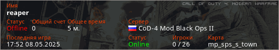 Играет на Call of Duty 4: Modern Warfare сервере. Страна: РоссияПервый раз замечен 17:48 08.05.2025