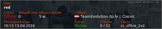 Играет на Counter Strike 1.6 сервере. Страна: ЛатвияПервый раз замечен 10:11 15.04.2026
