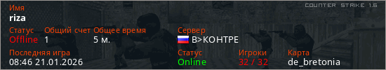 Играет на Counter Strike 1.6 сервере. Страна: РоссияПервый раз замечен 08:25 21.01.2026