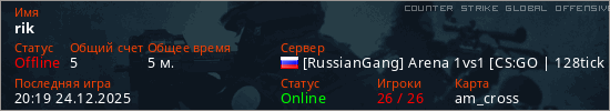 Играет на Counter Strike Global Offensive сервере. Страна: РоссияПервый раз замечен 19:56 24.12.2025