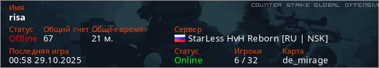 Играет на Counter Strike Global Offensive сервере. Страна: РоссияПервый раз замечен 03:53 25.10.2025