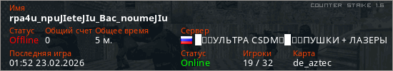 Играет на Counter Strike 1.6 сервере. Страна: РоссияПервый раз замечен 01:48 23.02.2026