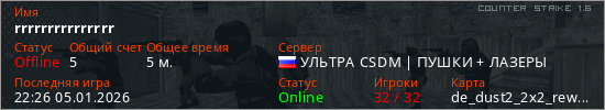 Играет на Counter Strike 1.6 сервере. Страна: РоссияПервый раз замечен 21:42 05.01.2026