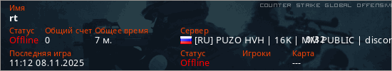 Играет на Counter Strike Global Offensive сервере. Страна: РоссияПервый раз замечен 11:01 08.11.2025