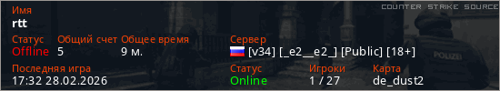Играет на Counter Strike Source сервере. Страна: РоссияПервый раз замечен 16:56 28.02.2026